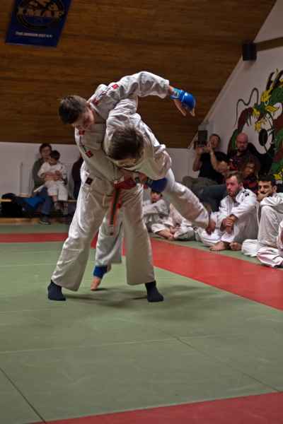 - der freien Selbstverteidigung, hierbei mussten sich die Prüflinge gegen Angriffe mit Kontakt, wie Würgen und Umklammern und Angriffe ohne Kontakt , wie Schlagen und Treten, verteidigen